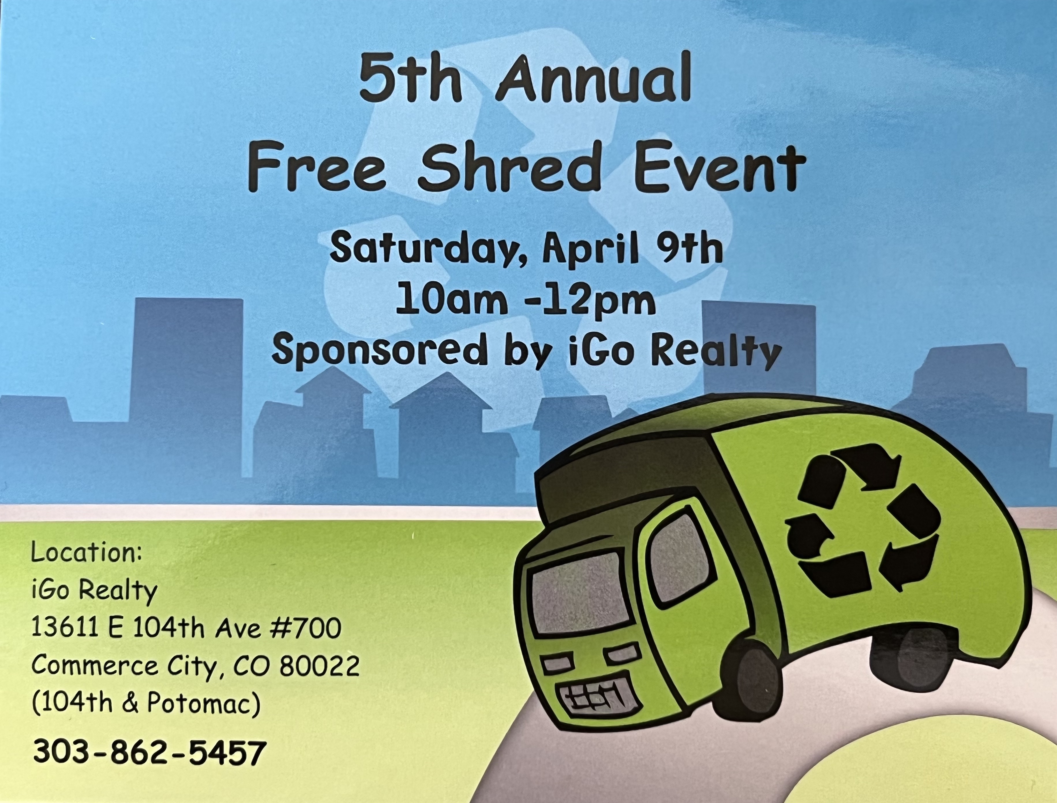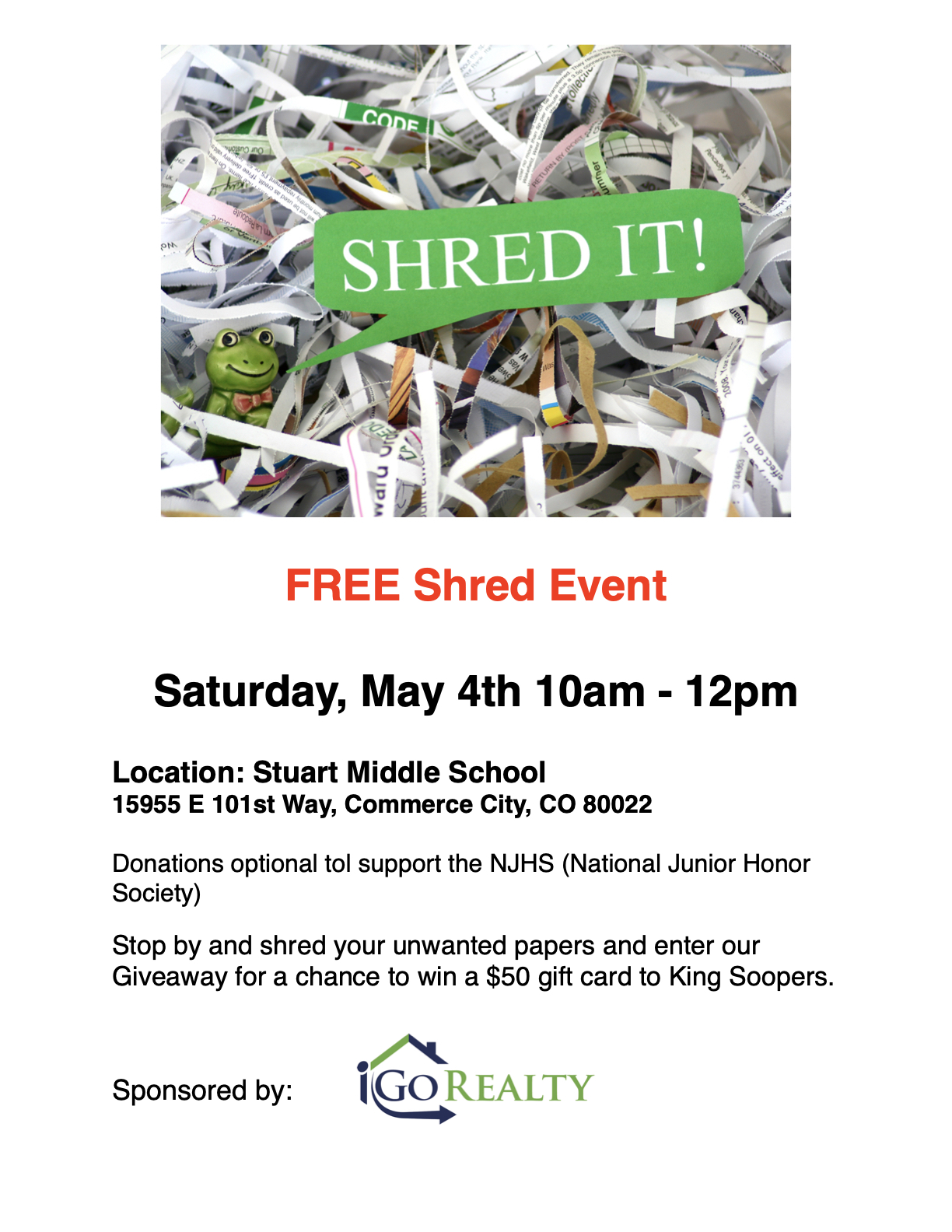 Stop by and bring all your unwanted paper items and join us for a day of recycling. iGo Realty will be giving away reusable shopping bags (1 per car). Enter our giveaway for a chance to win a $50 King Sooper's gift card.
